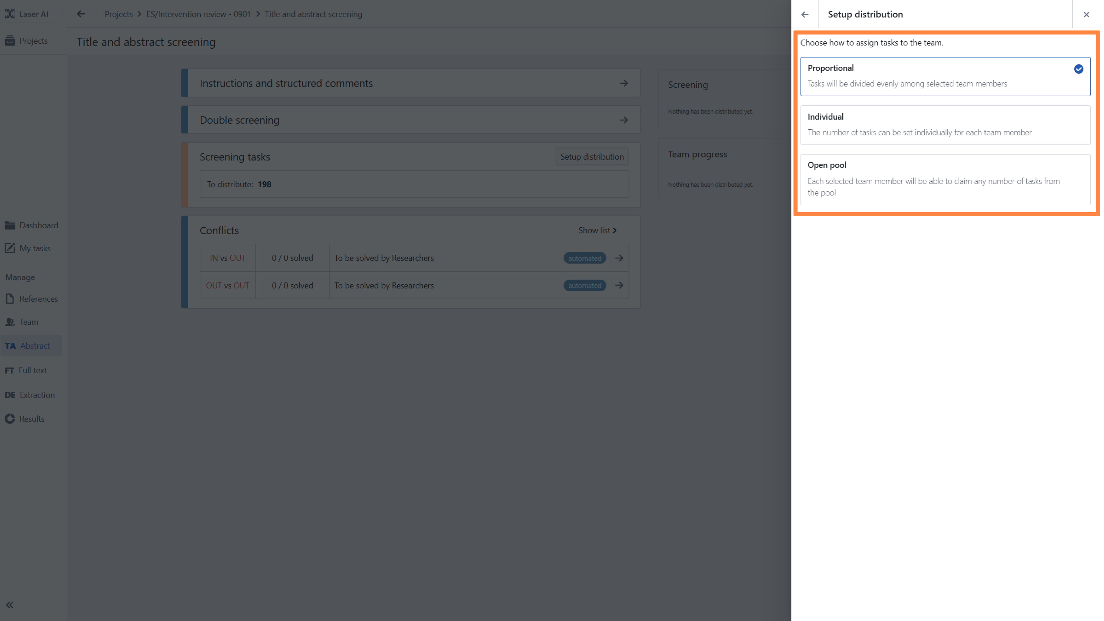 The next step is to select the number of references to distribute and the members of the team who will carry out the screening. You can then assign references in one of three ways - proportional assignment, individual assignment or open pool of tasks.