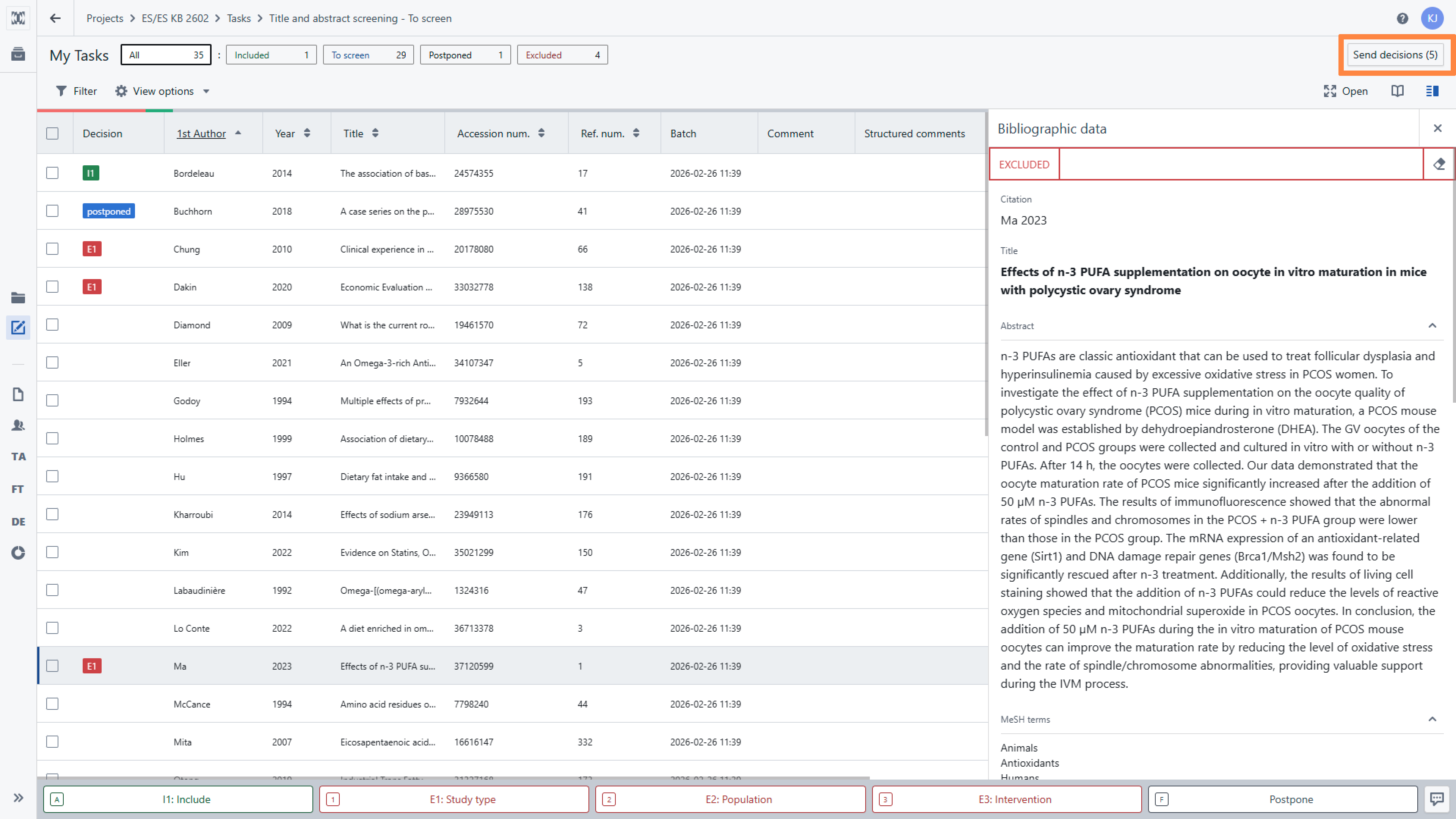 When you are satisfied with your screening decisions for a set of records, you should complete the screening process by clicking the ‘Send Decision’ button. Once you have done this, you will no longer be able to change the decision in the My task section. However, you will still be able to access them in the Tasks board, where they will be categorised as completed records.
