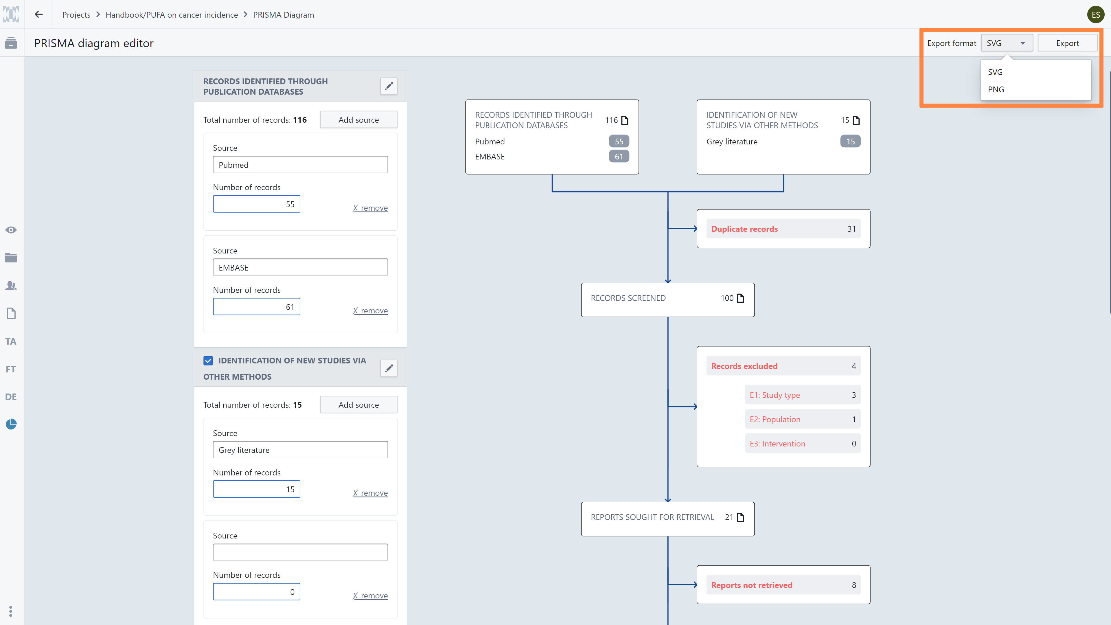 You can export finished PRISMA diagram in one of the selected formats - SVG or JPG.