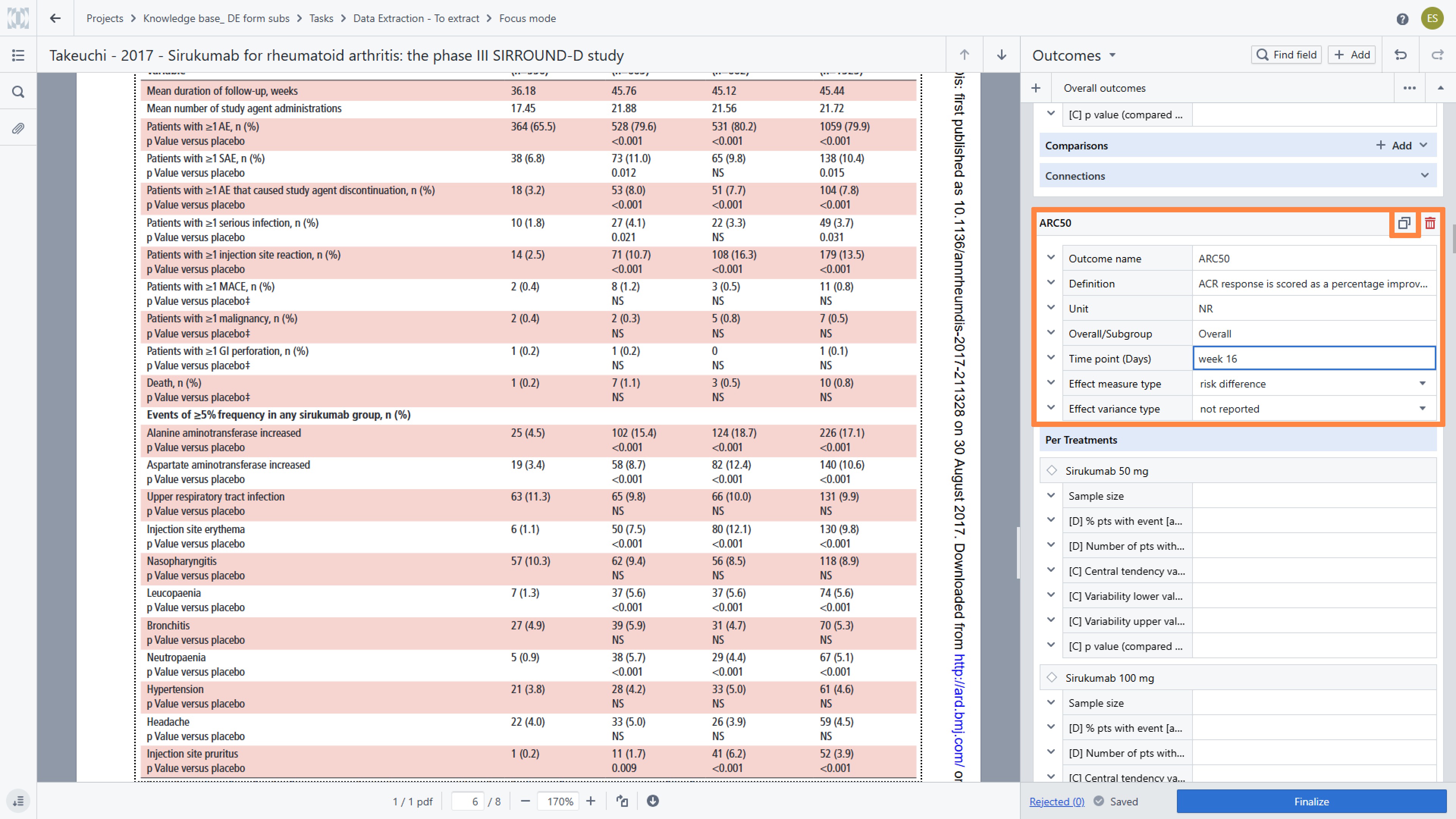 Data extraction focus mode view displaying a specific section:  1. Right side: Data extraction form 2. Center: PDF viewer 3. Left side navigation panel: PDF navigation and search bar,Panel for uploading attachments 4. Upper section: Button to switch to the next study 5. Bottom section: Export button and button to switch to the next PDF for the current study