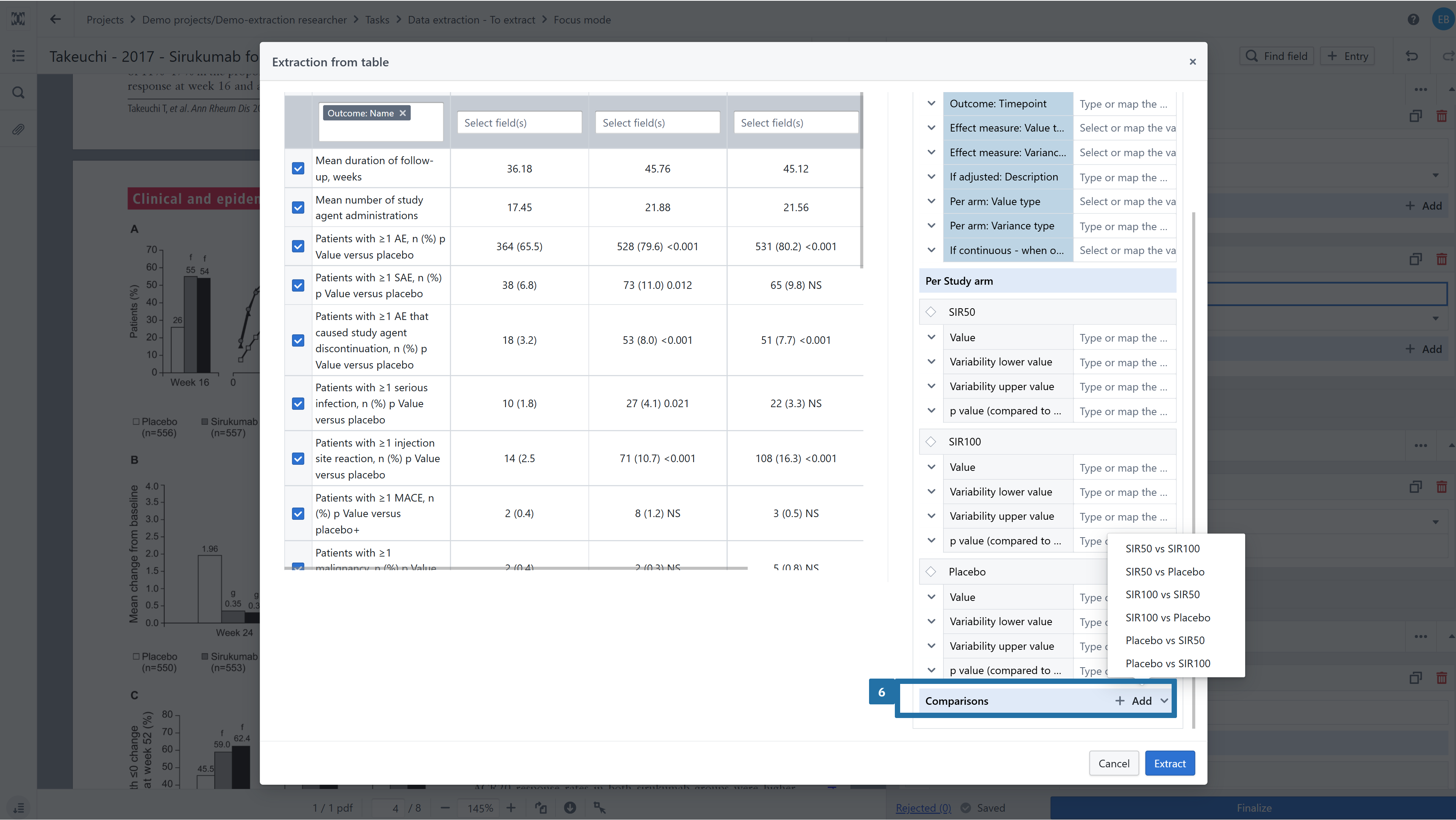 6. To extract comparison data, such as p-values between groups or odds ratios, first select the relevant comparisons from the list automatically generated by the tool based on the study arms you previously extracted.