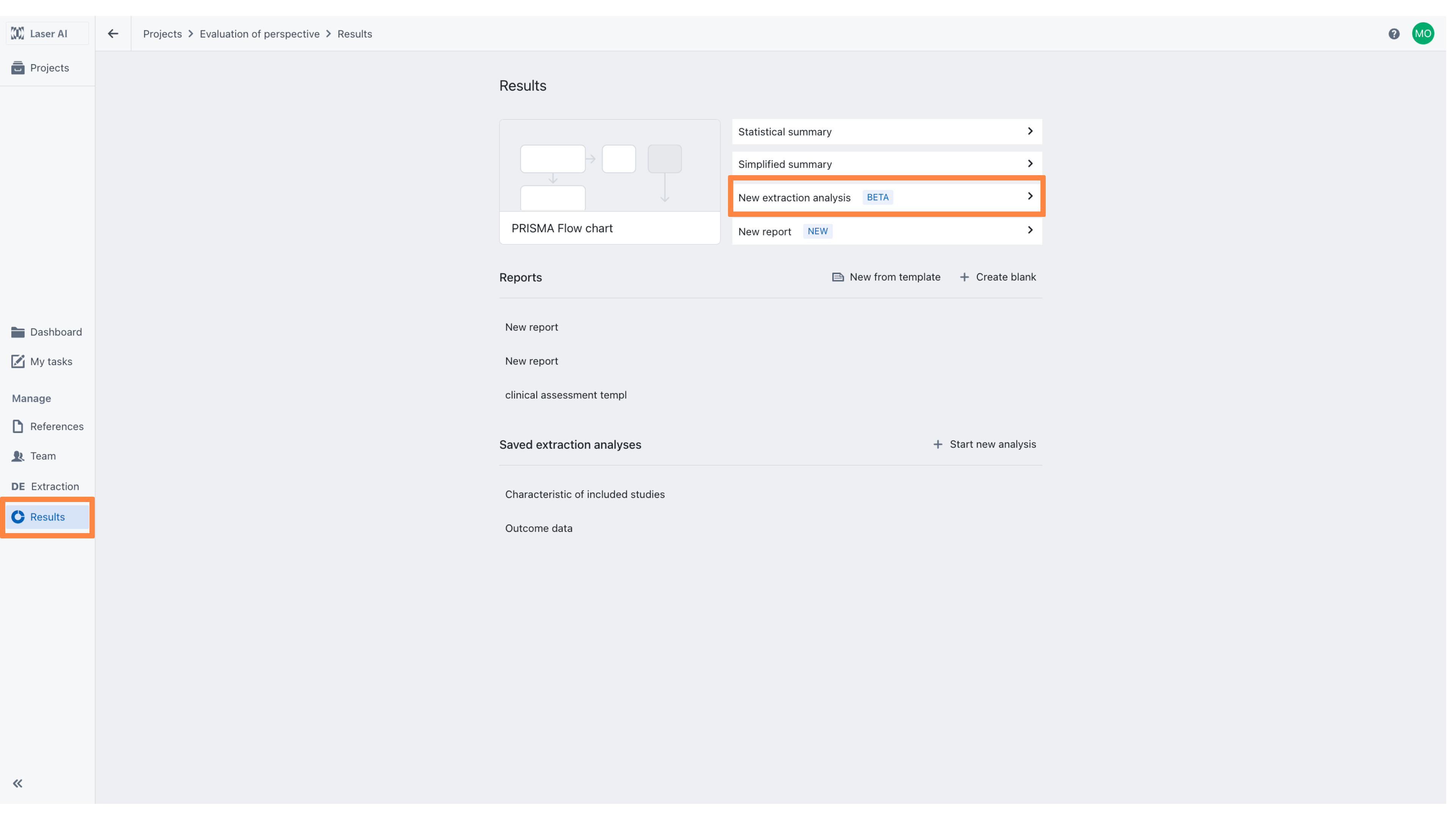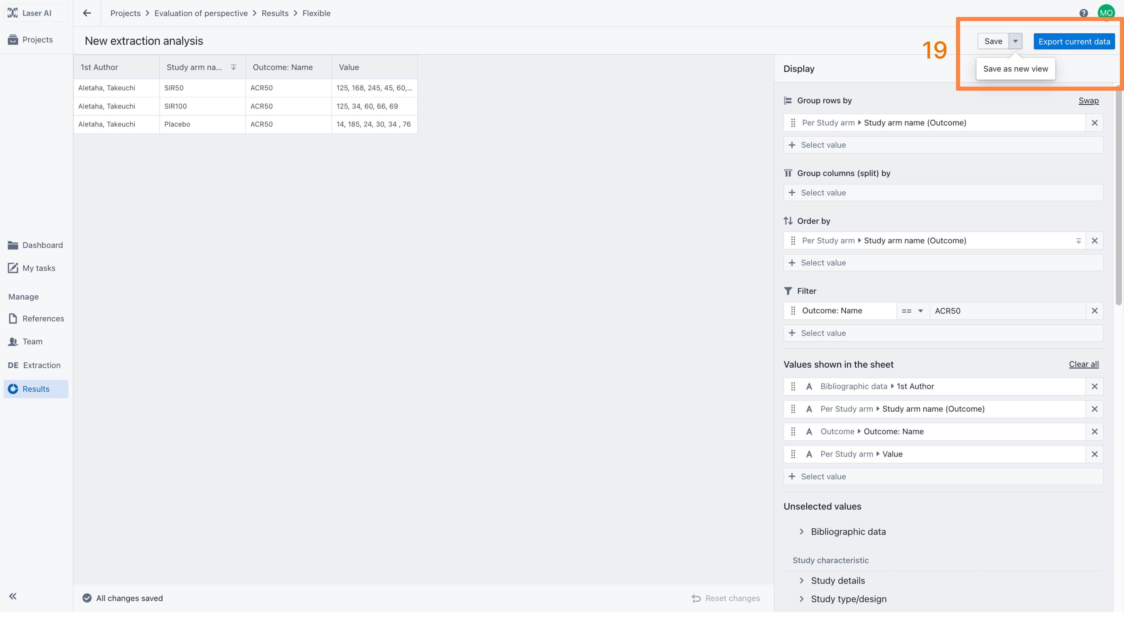 The Flexible Extraction Analysis module is designed to enable dynamic exploration and customization of extracted data. It allows users to filter results, select and arrange columns, group and aggregate data, and apply sorting to suit specific analytical needs. By adjusting how data is displayed, i.e. whether by study, intervention, outcome, or other variables, users can quickly generate tailored views that support efficient interpretation and reporting.