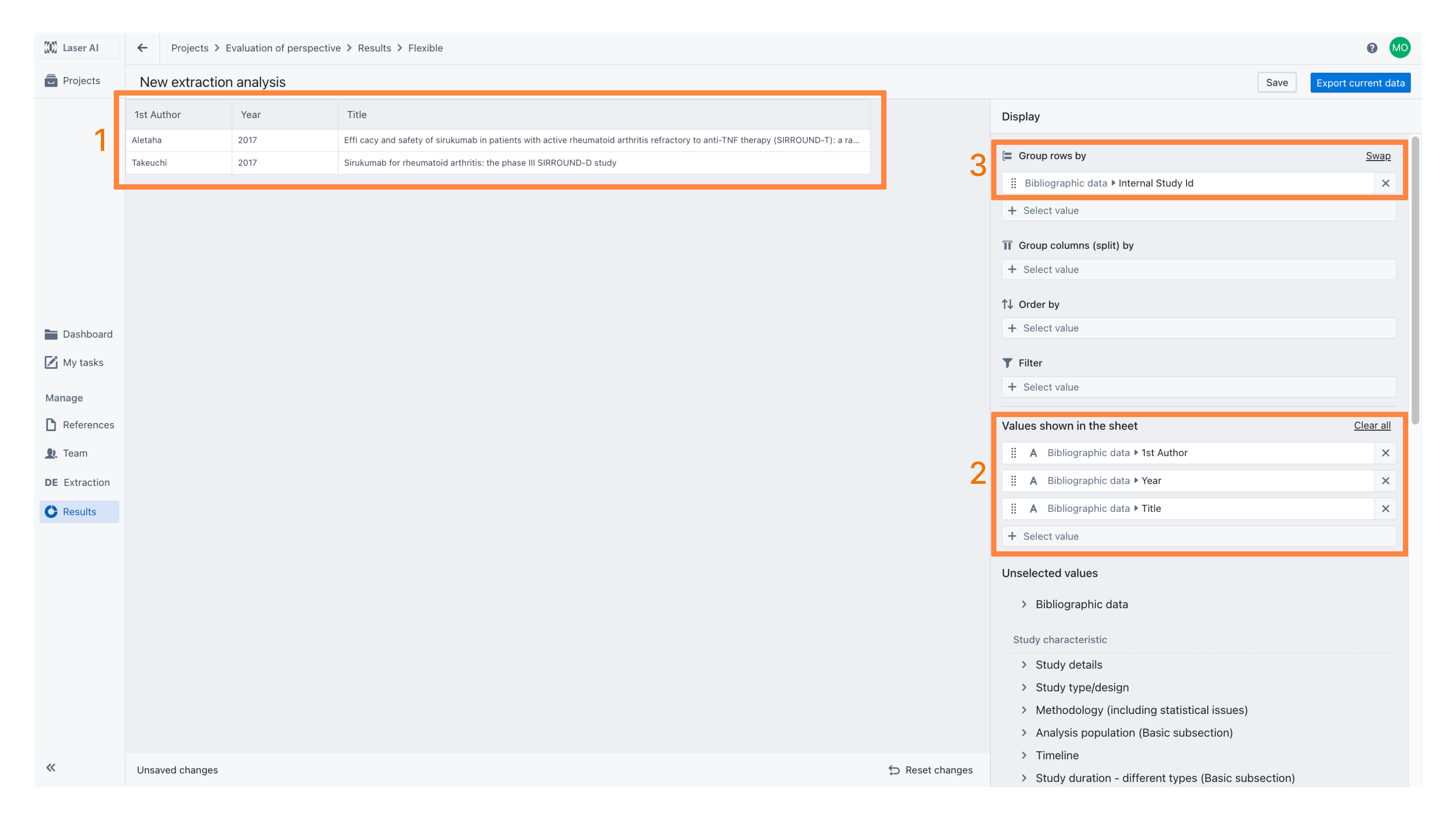 When you open a new Flexible Extraction Analysis, the default view will be as shown below. In this example project, data from two studies has been extracted [1]. The displayed columns include 'First Author', 'Year' and 'Title' [2]. Rows are grouped by Study ID [3].