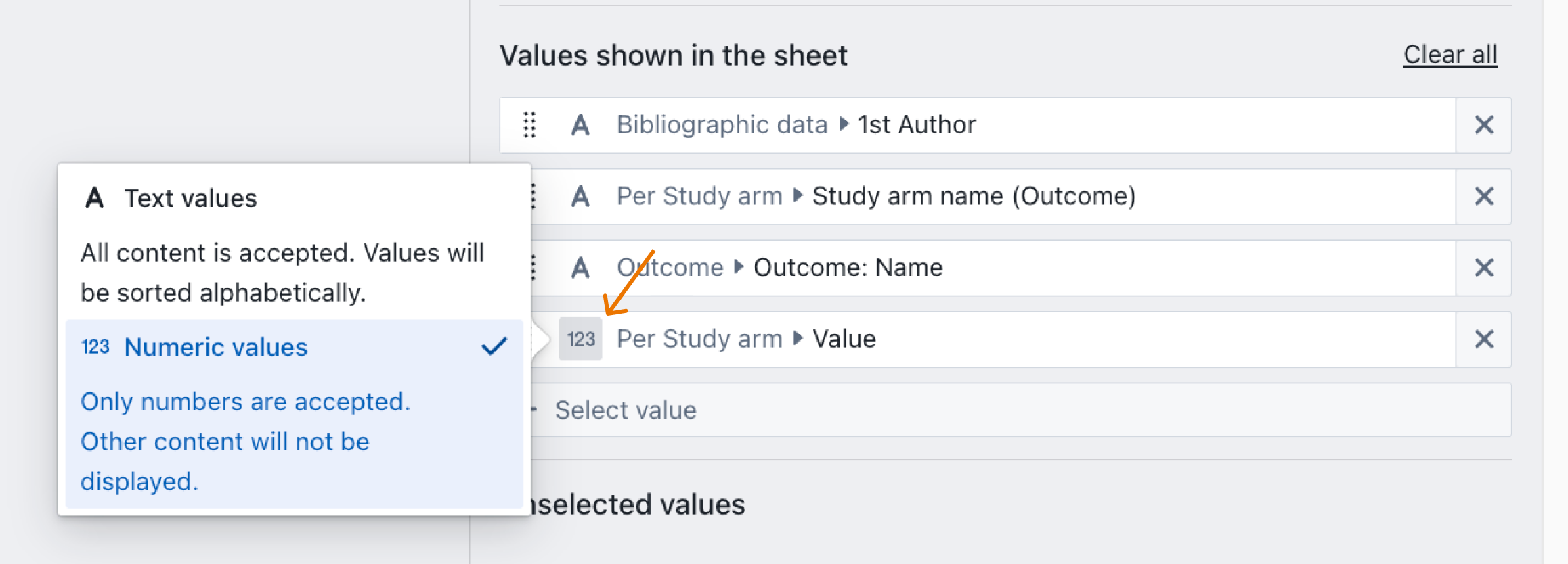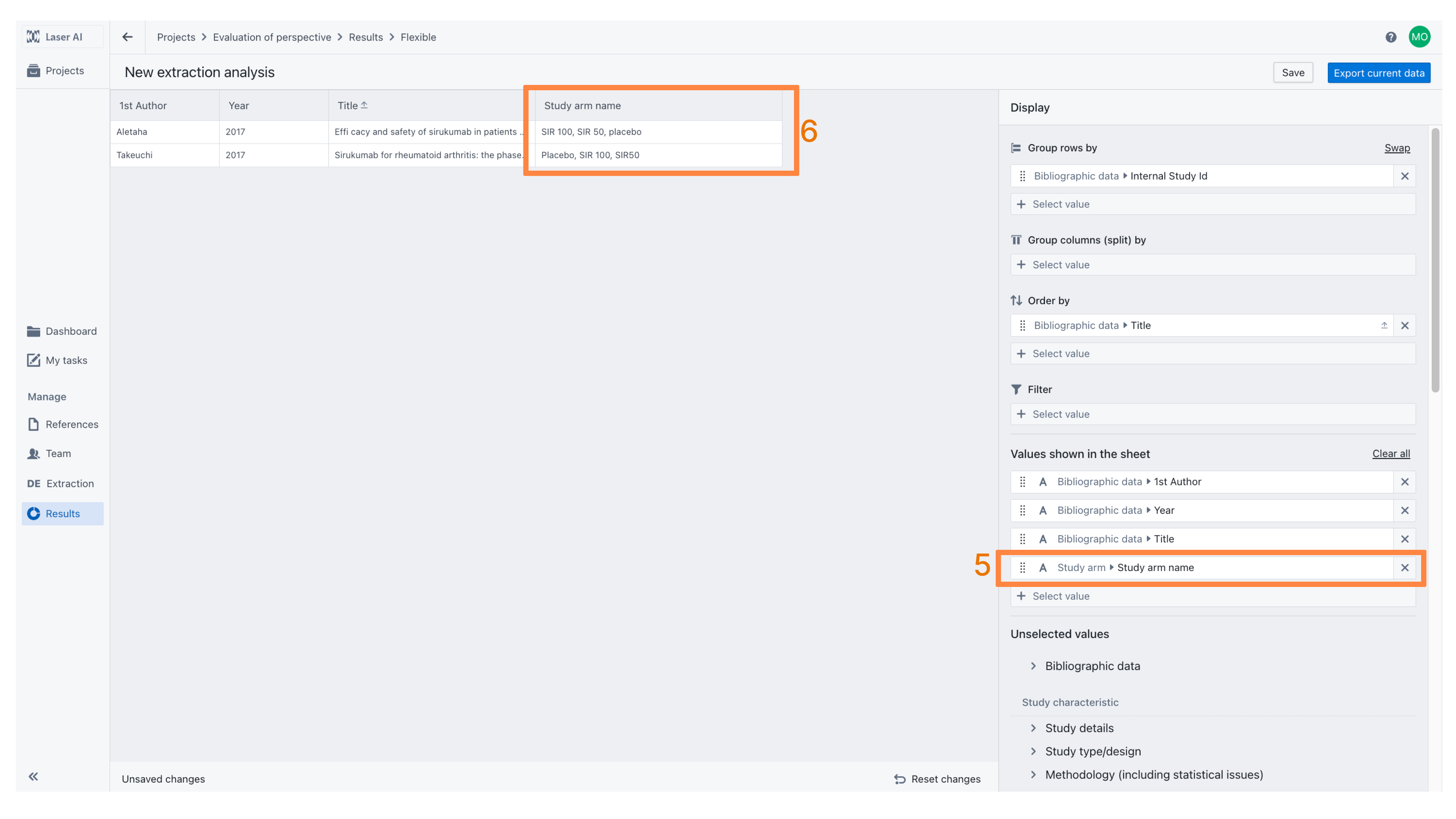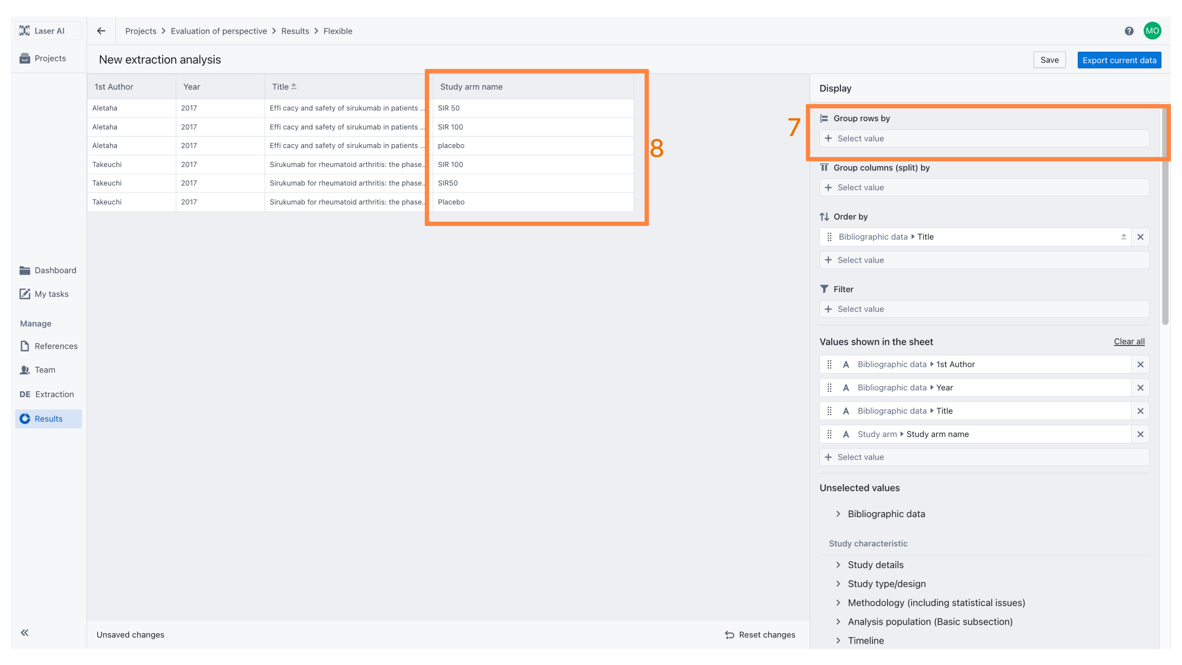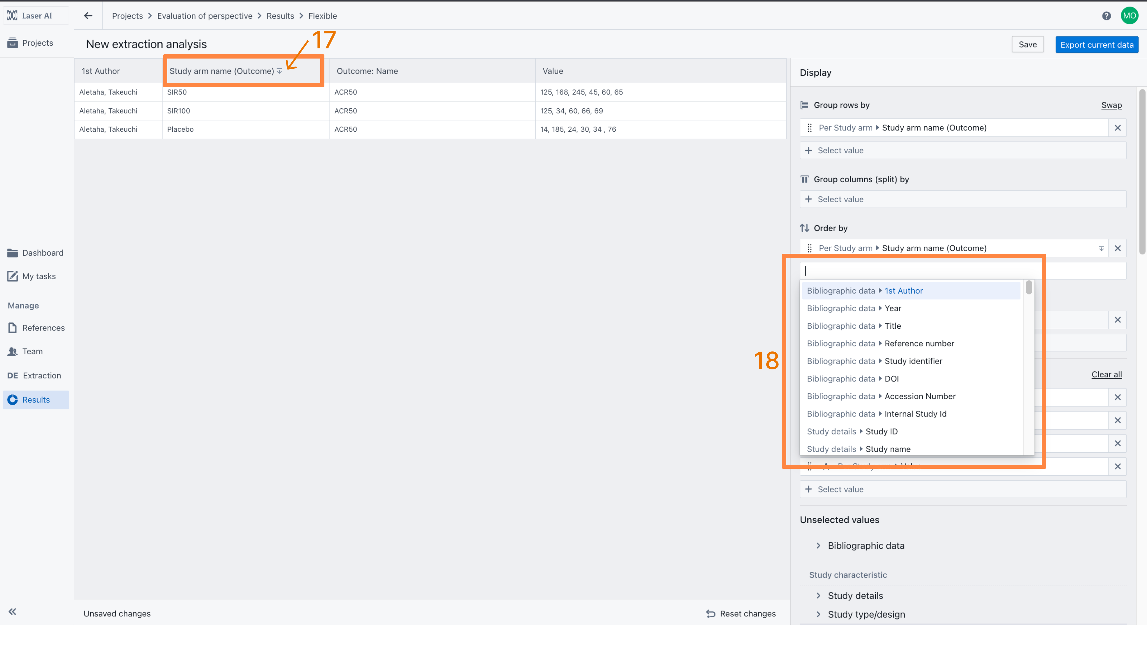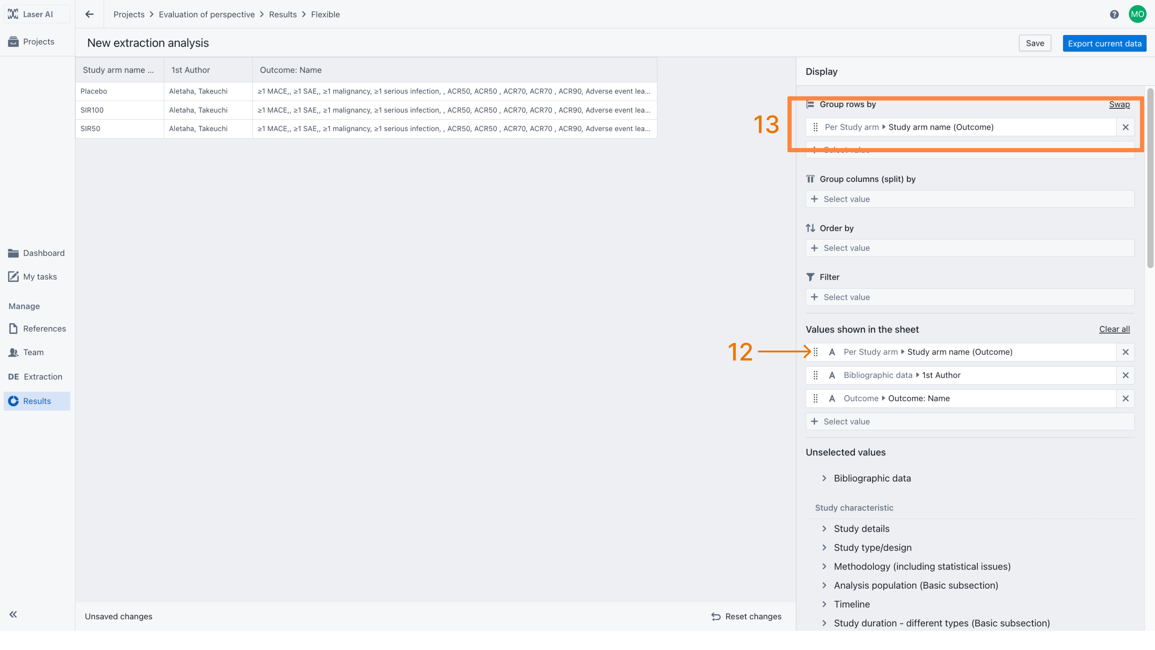 The order of displayed columns can be customized using drag-and-drop within the “Values shown in the sheet” section [12]. In this example, the results are grouped by Intervention (i.e., Study Arm Name) [13], which merges all outcomes measured for each intervention into a single row, regardless of the study in which they were conducted. For convenience, the Study Arm Name is displayed as the first column.
