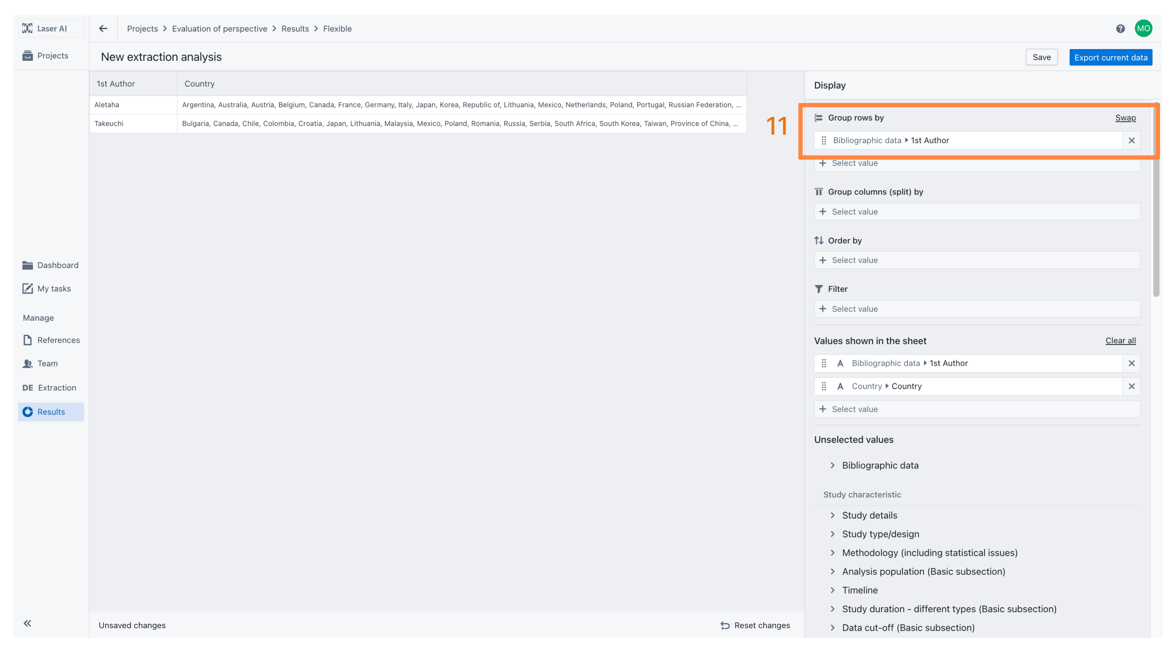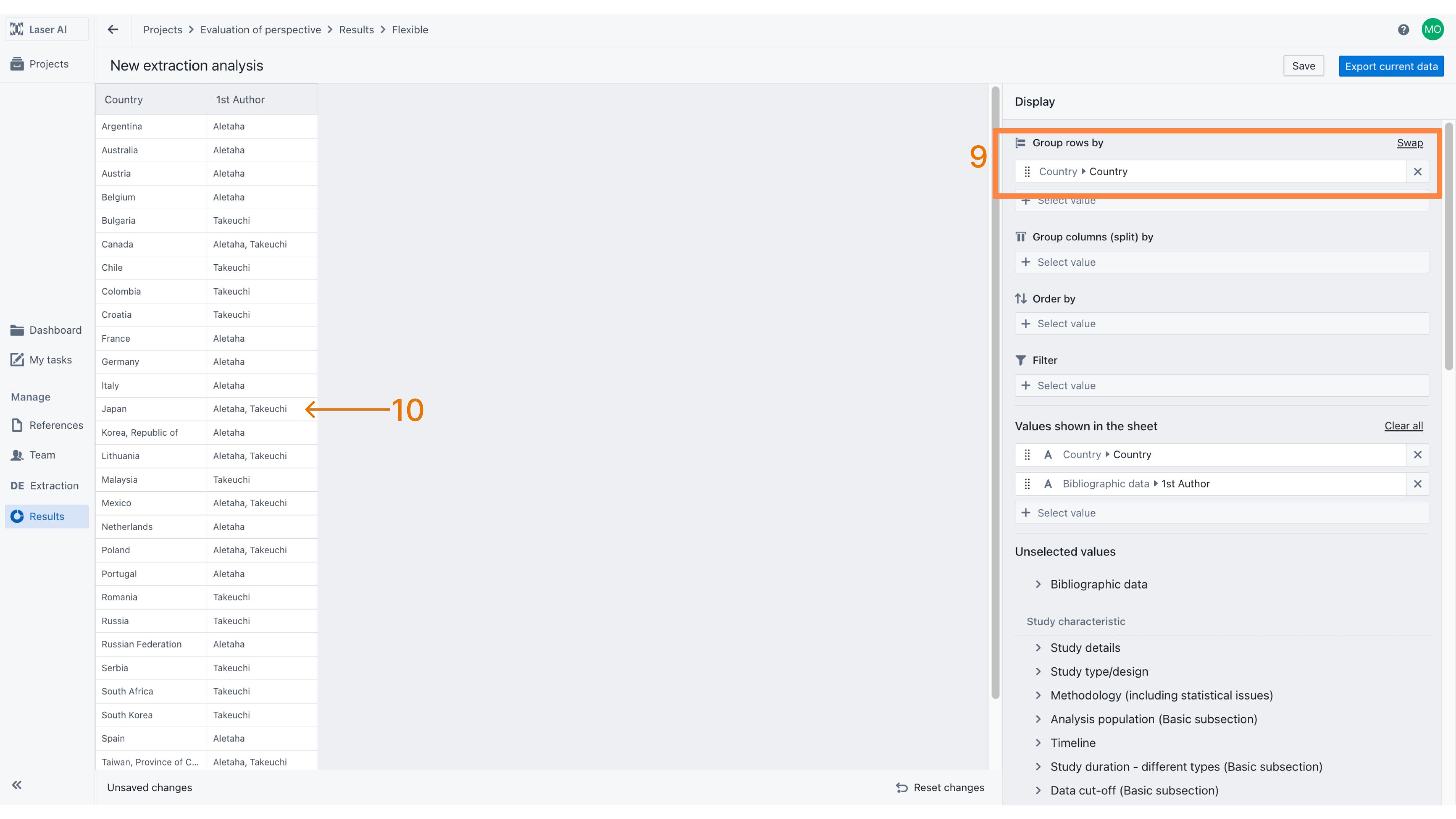 The results can be managed flexibly. For example, to identify the countries in which studies were conducted, the data can be grouped by Country [9]. This displays each country in a single row, with other values merged accordingly. For example, if multiple studies were conducted in the same country, their first authors will be displayed together [10].