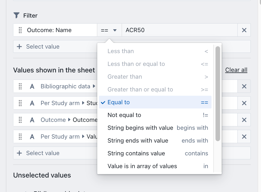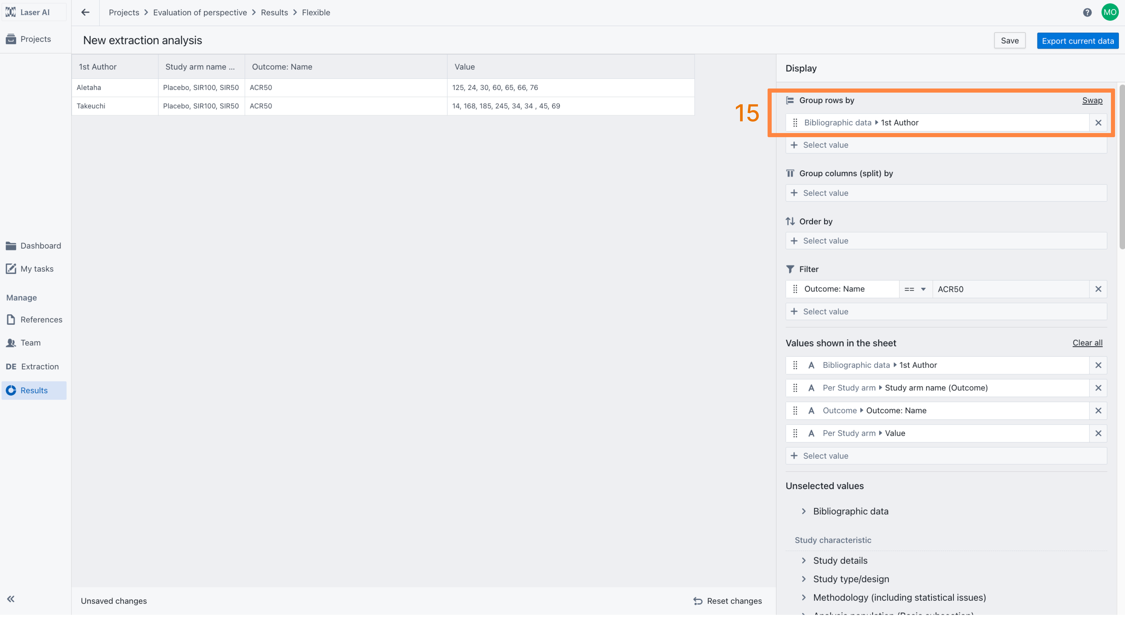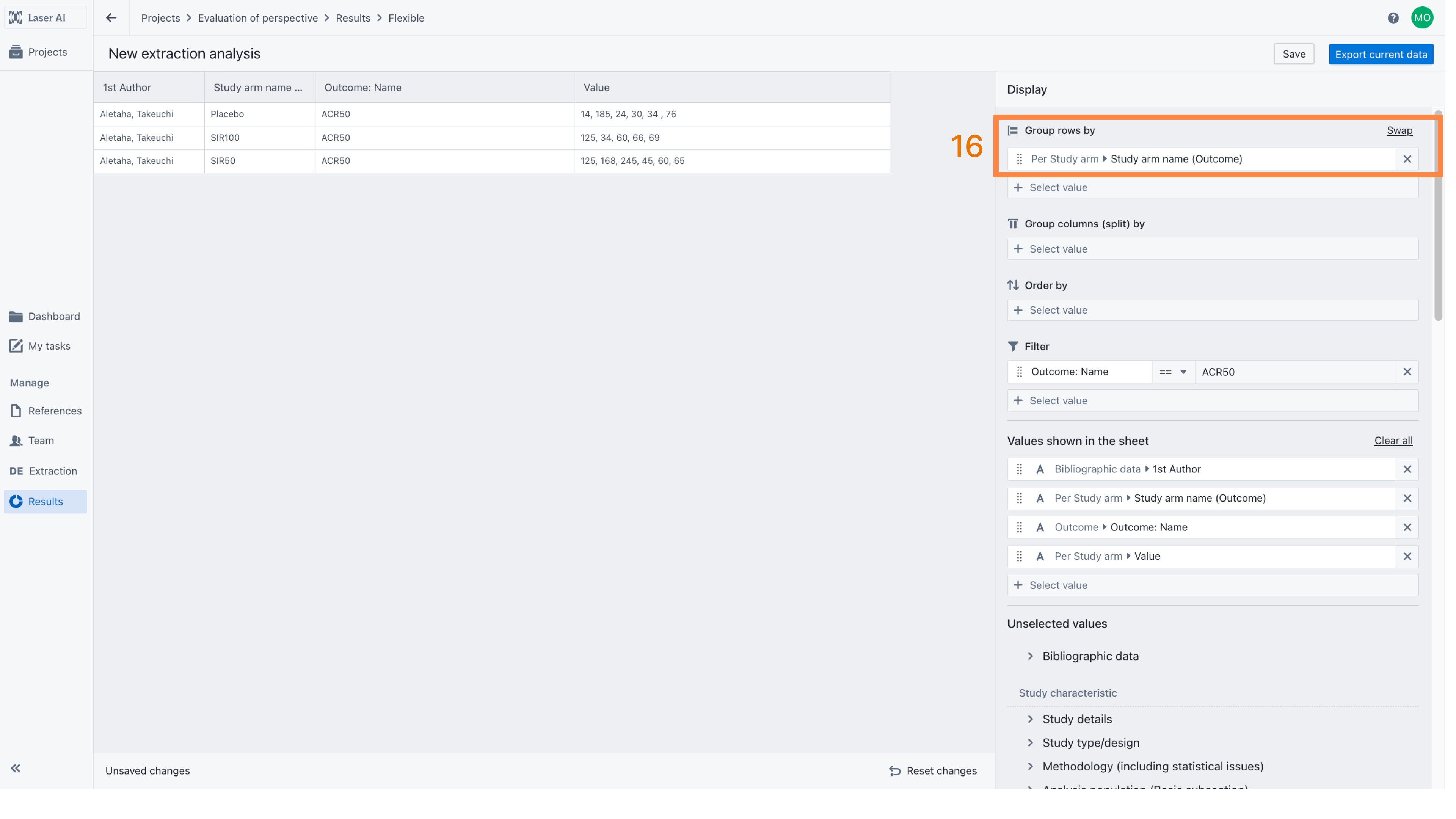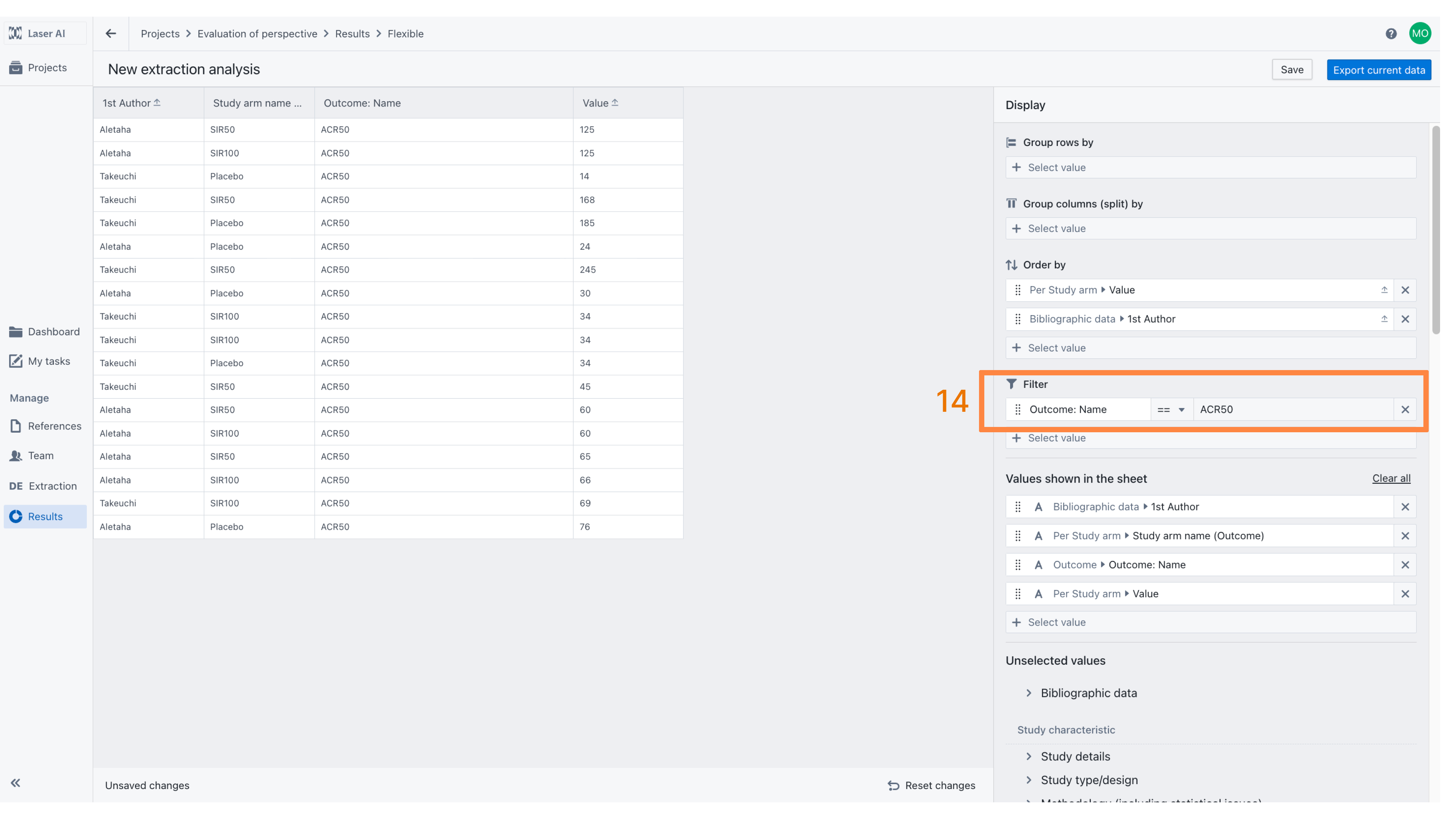 To display outcome values for a single outcome (e.g., ACR50), go to the “Filter” section and set Outcome Name equal to ACR50 [14]. To merge all outcome values into a single row, select an appropriate grouping option. For example, group by Study ID to display values separately for each study [15], or group by Study Arm Name to view results by intervention [16].
