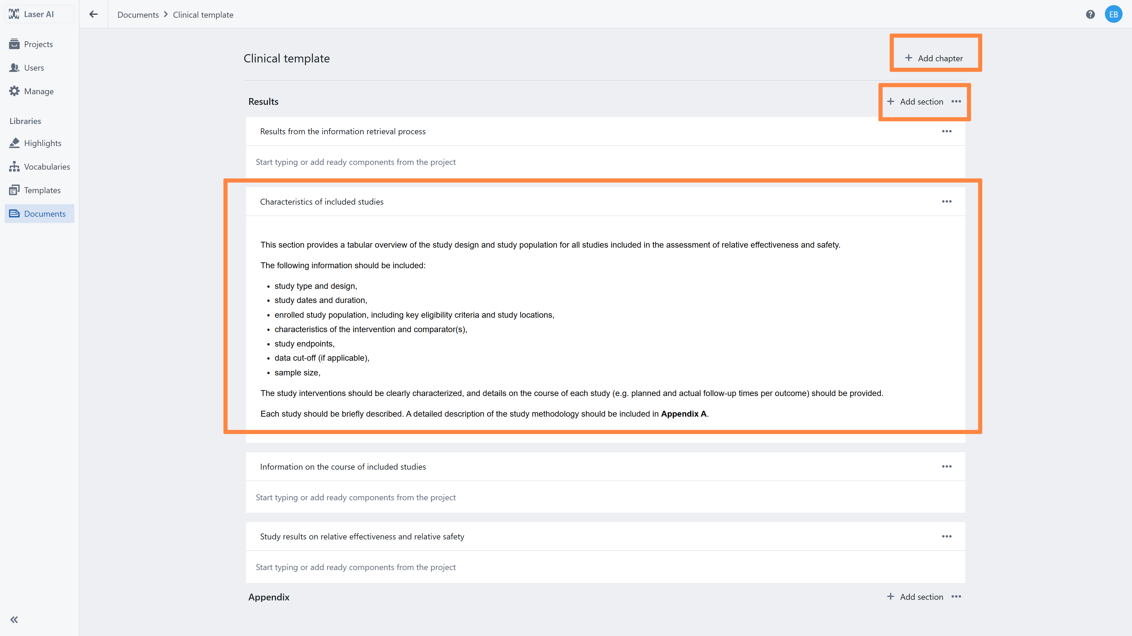 Within each chapter, add sections to further organize the content (e.g. under Methods: Study Design, Eligibility Criteria, Data Sources).Prepare content for each section