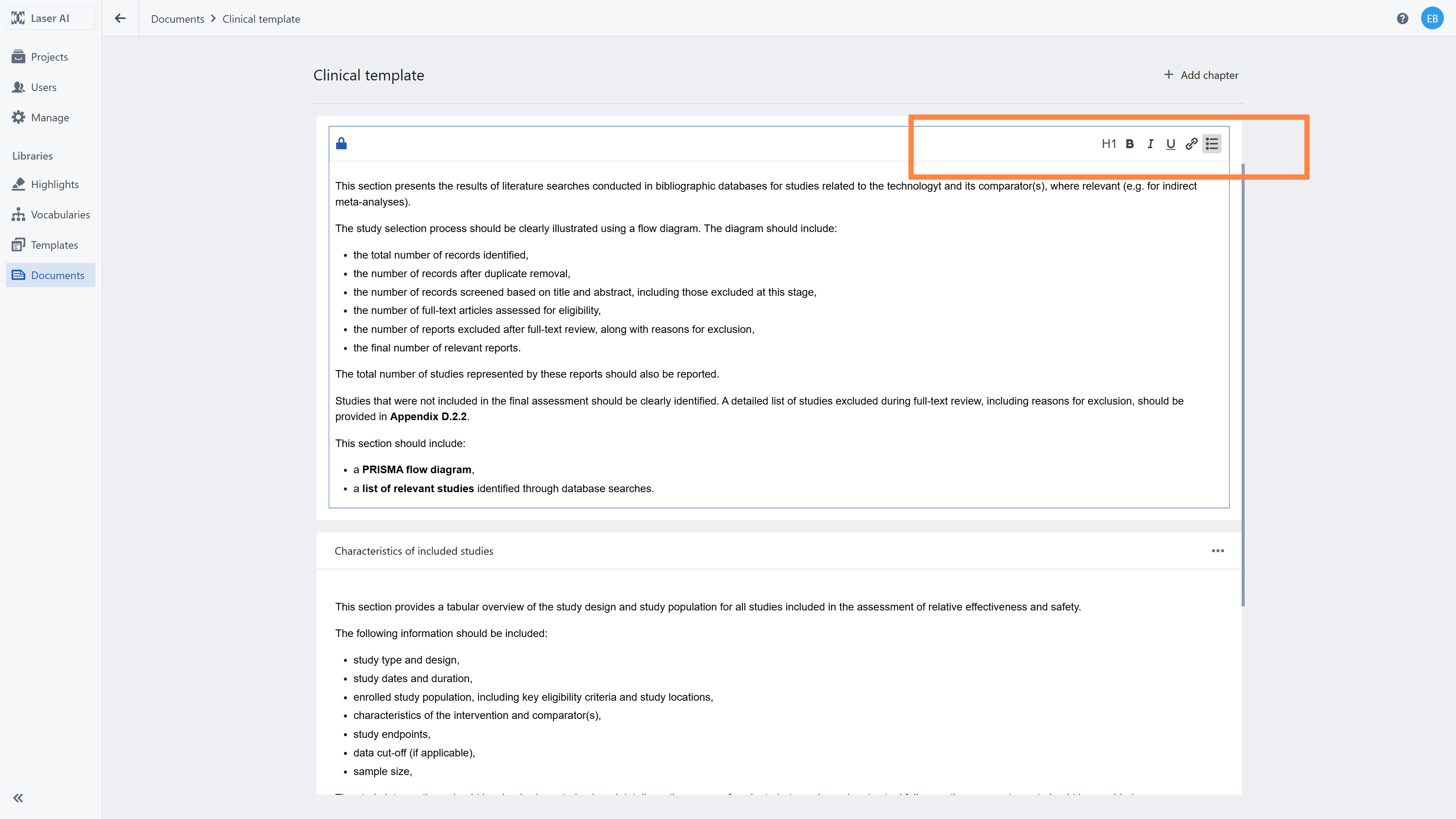 provide standardized text for commonly used parts (e.g. methods description for a clinical intervention review),